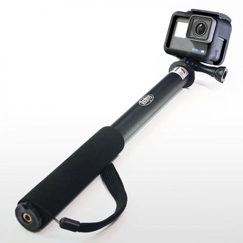 1本は持っておきたい伸縮グリップ。最大の長さは約3倍伸びます。しっかりした持ち味なので安定した撮影が可能です。4段伸縮の固定と解除の切り替えは、シャフトをひねるだけというシンプルな設計も人気の理由です。1/4インチネジの使用で、通常のデジカメなども装着可能になるアダプター付き。