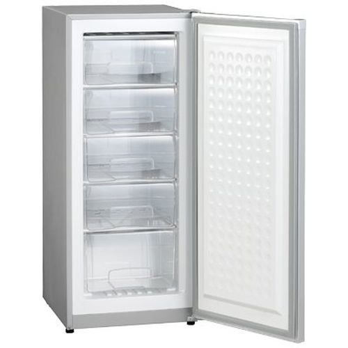 ●外形寸法:幅519×奥行600×高さ1225mm。●庫内寸法:幅372×奥行338×高さ1031mm。●カゴサイズ(上段)約幅330×奥行360×高さ140mm、(最下段)約幅330×奥行150×高さ195mm。●有効内容量144L(食品収納スペース117L)。●重量:44kg。●消費電力:70W。●年間消費電力:204Kwh/年。●冷却方式:直冷式。●本体色:シルバーグレー。●庫内温度:-20℃。