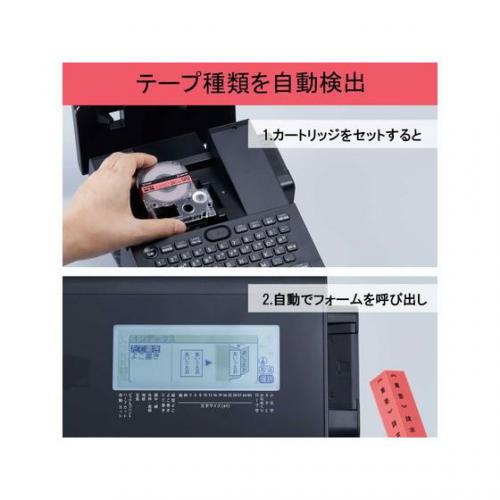 「テプラ」PROテープカートリッジをセットすると、テープの種類を自動で識別できるようになりました。テープの種類に合わせて、印刷の速度や濃度、自動カットなどを最適な設定で印刷することができるだけでなく、それぞれに合わせた印刷フォーマットや特殊印刷メニューを呼び出します。各種設定を一つずつ操作する手間が省け、効率的なラベル作りをサポートします