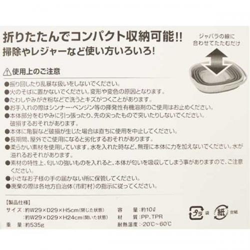 ●商品サイズ (約)W29×D29×H5cm(閉じた状態) (約)W29×D29×H24cm(開いた状態) ●重量 (約)535g ●容量 (約)10L ●材質 PP、TPR ●耐熱温度 -20℃〜60℃