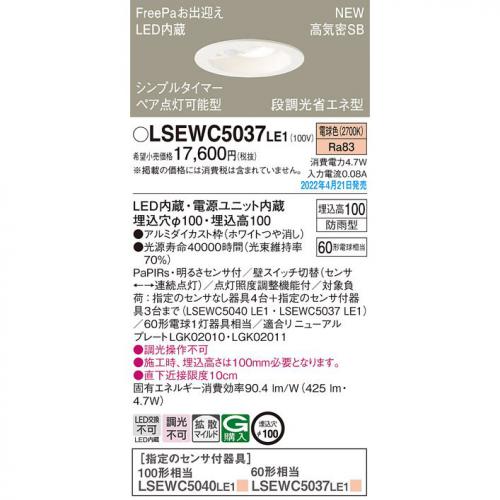 パナソニック Panasonic LEDダウンライト 白熱電球 60形 FreePaお出迎え 電球色 LSEWC5037LE1