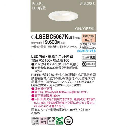 パナソニック Panasonic LEDダウンライト60形 電球色 LSEBC5067KLE1
