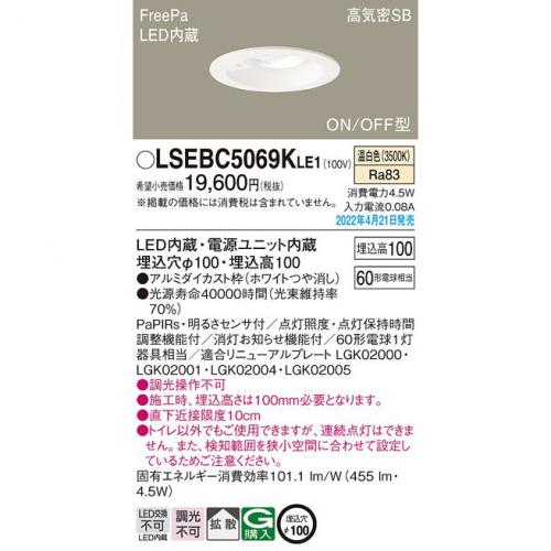 パナソニック Panasonic LEDダウンライト 60形 温白色 LSEBC5069KLE1