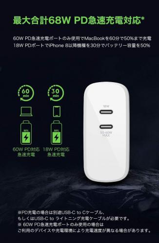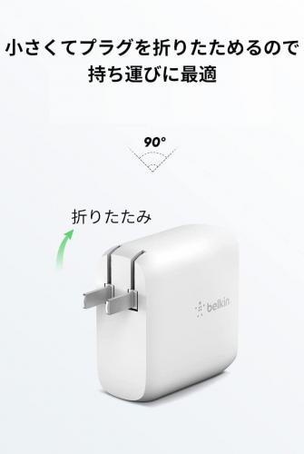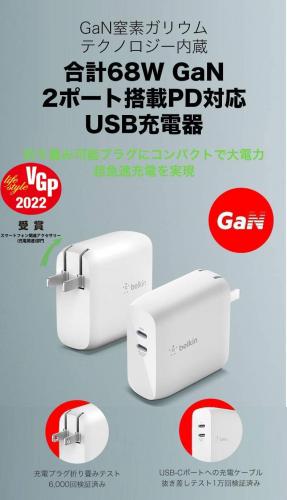 BELKIN 充電器 USB-C 2ポート 68W(18W + 50-60W) PD 急速充電 GaN 折りたたみ式プラグ WCH003DQWH