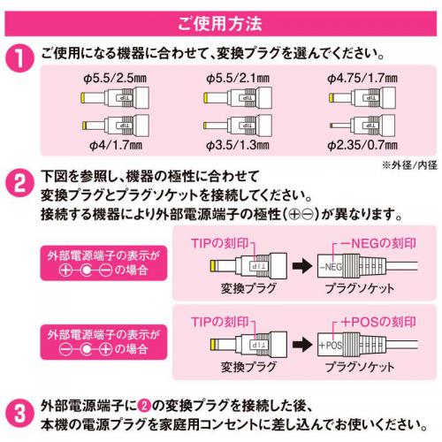 ■ 付属品:変換プラグ(外径/内径)…φ5.5/2.5mm、φ5.5/2.1mm、φ4.75/1.7mm、φ4/1.7mm、φ3.5/1.3mm、φ2.35/0.7mm