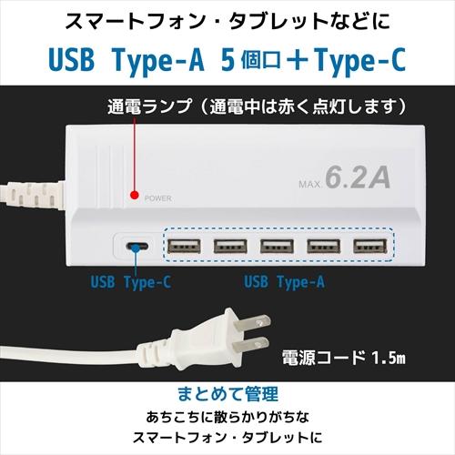 ■充電ポートUSBType-A5個口+Type-C1個口搭載。■最大電流全ポート合計6.2A。■最大出力容量を超えた場合、保護機能が作動し電源供給をストップ。