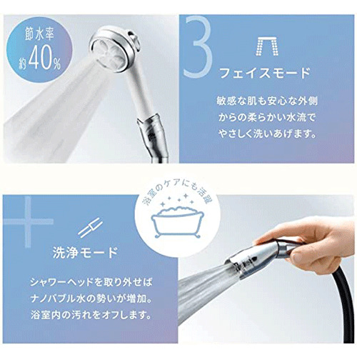 独自のナノバブル発生機構を搭載。シャワーを浴びるだけで自然な潤い肌を実感いただけ、優れた保湿力により潤い肌が持続します。また通常の水の気泡では大きすぎて毛穴に入りませんが、ナノバブルなら隅々まで入り、汚れをかき出します。一般的なシャワーの約4.2倍の洗浄力。