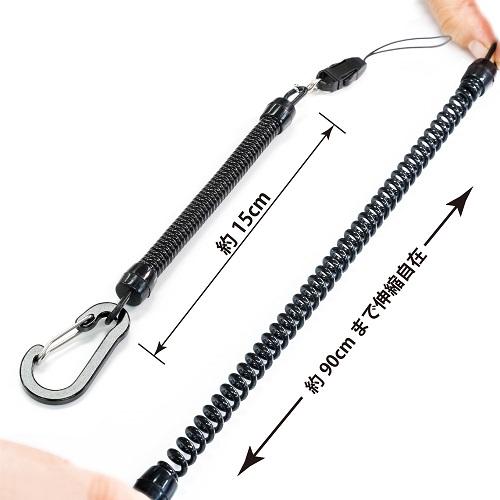 最大90cmまで伸長するので、カラビナで装着した状態でもスムーズに使用できます。