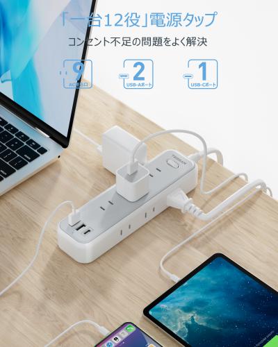 【一台12役電源タップ】:これはAC差込口9個口とUSBポート3口が一体となったのUSBタップです。まとめて12台の機種が同時に充電で、コンセント不足が解決できます。USB接続機器はデジダル製品の入力電流を自動検知し、最適な電流を送ります。コンパクトな設計の上に機能性もよく 実現します!