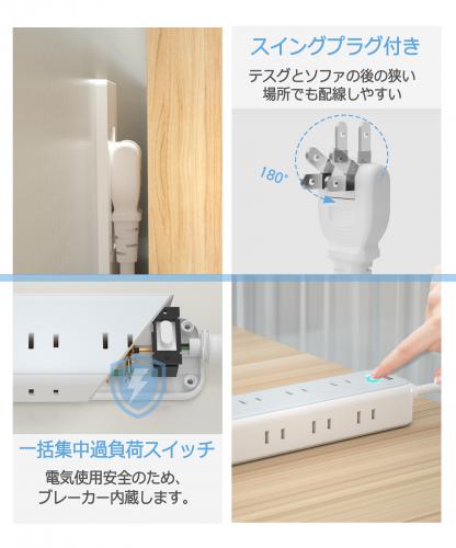 【使用者の便利に配慮】:この延長コードは日本のために研究し、設計されています。180°スイングプラグを採用して、狭い場所でも配線しやすい。使い勝手のいい3mケーブルを採用し、コンセントから少し離れた場所でも利用できます。家庭、オフィス、会議室、パーティーなどにも大活用できます。