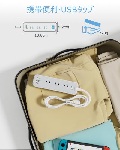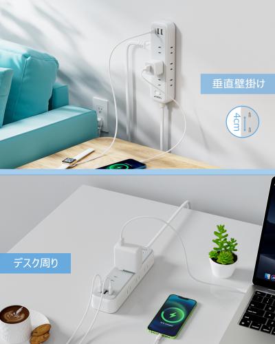 【壁掛け用卓上に】:コンセントタップは壁等に仮固定できるフック穴付き、壁にかけてご利用できます。省スペースで、配線もスッキリになります。テーブルタップの底の四角にゴム製の滑り止めがついており、卓上で安定感があります。両立な使い方あり、お客様に心地よい生活を与えます。