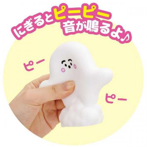 ぷしゅぷしゅが雲に乗っている可愛いデザインが特徴的なやわらか素材のなき笛入りソフビです。