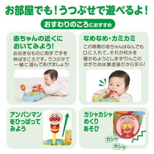 鈴の入ったアンパンマンのマスコットやりんごのはがため、つまみひもなど、脳を育む遊びがたっぷり10種類!