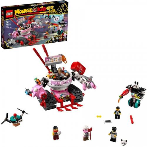 ・レゴモンキーキッド ピグシーのラーメンタンク(80026)で戦いを始めようラピッドシューター搭載のラーメンタンク、レモネード砲搭載のパンダロボット、出前ドローンがセットになっています。
