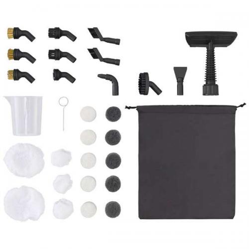 ●付属品:アングルノズル、ポイントブラシ×2、スクレーパー、真鍮ブラシ×3、ポイントパッド用ノズル、ポイントパッド白(研磨剤なし)×5、ポイントパッド黒(研磨剤あり)×5、ノズルクリーニングピン、換気扇セットブラシ×2、換気扇セット布カバー×3、コンパクトノズル、すきま用ブラシ×2、メジャーカップ、布カバー×2、部品袋