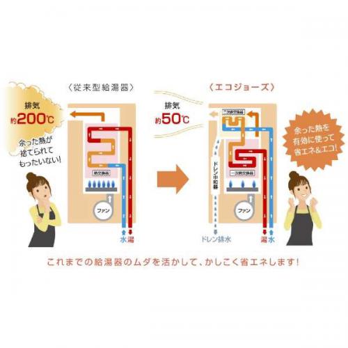 「エコジョーズ」とは、少ないガス量で効率よくお湯を沸かす省エネ性の高い給湯器です