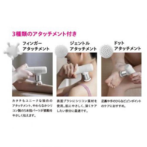 ●3種類のアタッチメント付き。フィンガーアタッチメントはカタチもユニークな独自のアタッチメント。やわらかなシリコン製の5本指パーツが振動をやさしく伝えます。