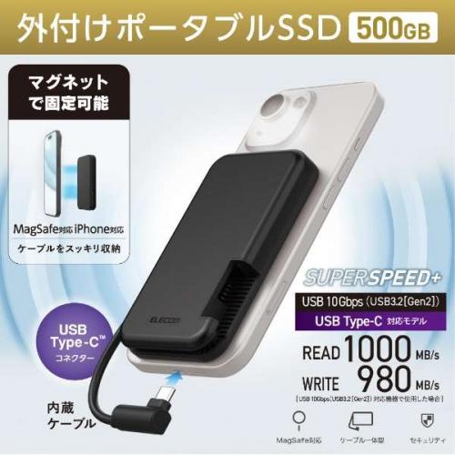 エレコム ELECOM 外付けポータブルSSD 500GB マグネット付き USB-Cケーブル一体型 ブラック ESD-EPB0500GBK