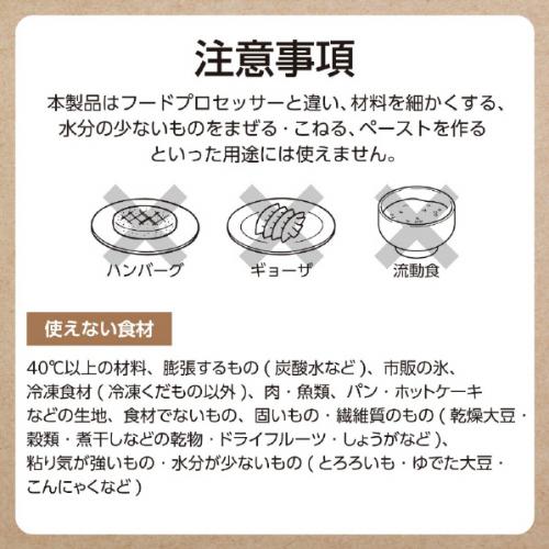 ●冷蔵庫の角氷を砕いてクラッシュアイスに。冷凍保存した果物をそのまま入れることも可能です。●※角氷は、家庭用製氷皿の角氷10個まで。冷凍果物は、2cm角以下のものを5個まで。冷凍果物を入れる際は、必ず一緒に液体を160ml以上入れてご使用ください。