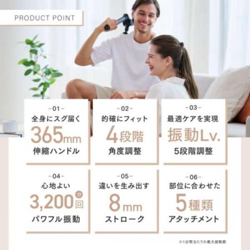 シリーズ最長約365mmの伸縮ハンドルと4段階に調整可能なアームを備えたハンディガンなので、1人ではケアしづらい背中や腰も簡単フィット。
