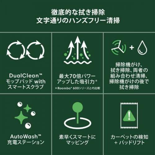 ■付属品 ロボット本体、バッテリー(内蔵)、AutoWash 充電ステーション(紙パック装着済み+交換用紙パックx1)、電源コード、パッドプレート&モップパッドx1セット(2個)、交換用DualClean モップパッドx1セット(2枚)