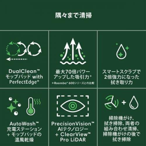 ■付属品 ロボット本体、バッテリー(内蔵)、AutoWash 充電ステーション(紙パック装着済み+交換用紙パックx1)、電源コード、パッドプレート&モップパッドx1セット(2個)、交換用DualClean モップパッドx1セット(2枚)