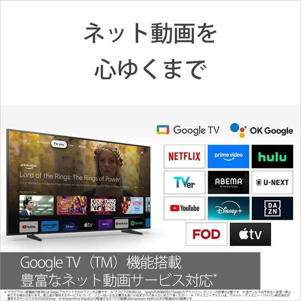 Google TV(TM)機能搭載なのでネット動画の視聴に最適。映画、音楽、ゲームなどあらゆるジャンルのコンテンツを楽しめます。また、視聴履歴や好みに合わせて、Google があらゆる動画配信サービスの中からあなたにぴったりのコンテンツをおすすめするので、お気に入りのエンターテインメントを心ゆくまで楽しめます。さらに、Google アシスタントを使えば、音声でコンテンツの検索やテレビの操作もできます。