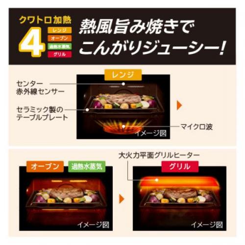 レンジ、オーブン、過熱水蒸気、グリルを使い、表面はこんがり焼き上げて、肉料理はジューシーに、魚料理はふっくらと焼き上げます。