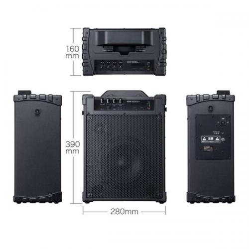 ●マイクミキシング機能を搭載しており、外部入力からの音楽などをスピーカーから出力することができます。カラオケスピーカーとして利用したり、結婚式の2次会やパーティーなどにバックミュージックと共にアナウンスを流したりできます。
