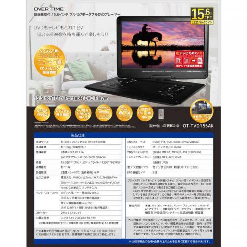 OVER TIME オーバータイム 15.6インチ フルセグ ポータブルDVDプレイヤー OT-TVD156AK