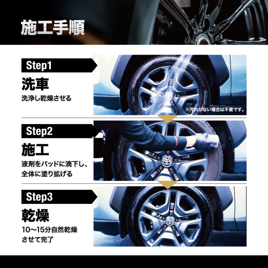 タイヤが汚れている場合は洗浄/乾燥させて下さい。その後液剤を適量パッドに滴下し、タイヤ表面全体に塗り広げてください。10~15分自然乾燥で完了です。