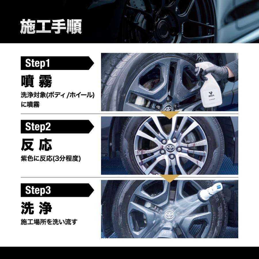 洗浄前の汚れたボディやホイール等に鉄粉除去剤をスプレー塗布、2~3分で鉄粉が反応し、紫色に変色致します。スポンジやブラシなどを使って洗い、水でよくすすいでください。