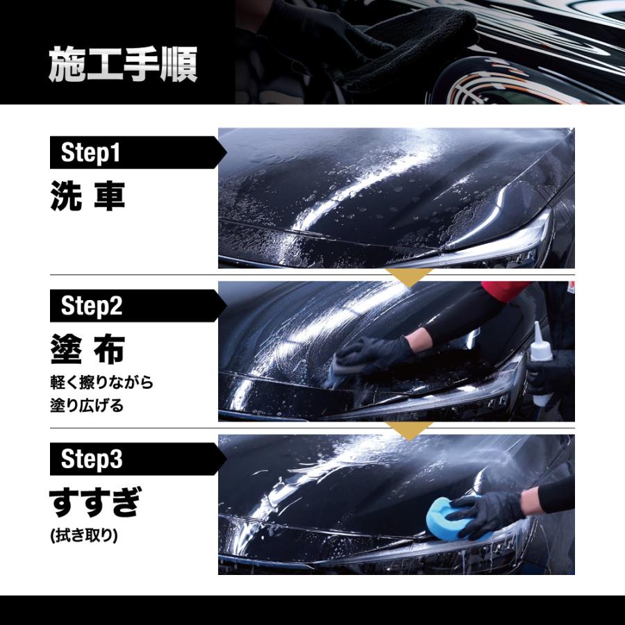 多量の水で塵・埃・砂等を十分に洗い流します。同梱されている塗布用パッドに適量滴下し、パネル全体にムラなく