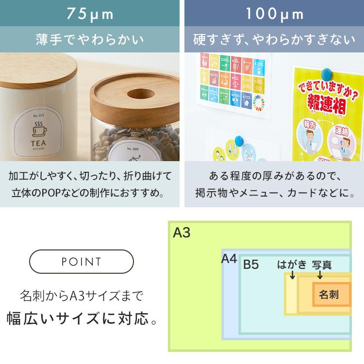 ●フィルムは「75μm」と「100μm」から選べるので、用途に合わせたラミネートができます。