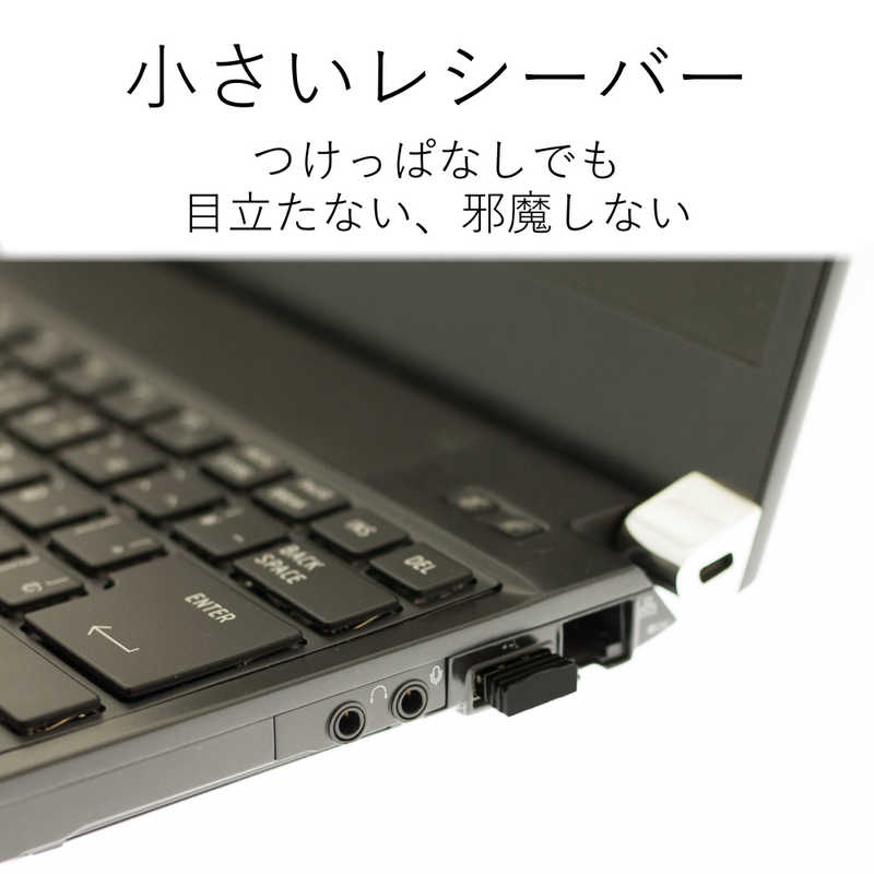 ノートパソコンのUSBポートに接続しても気にならず、装着したまま持ち運び可能な1円玉サイズのマイクロレシーバを採用しています。