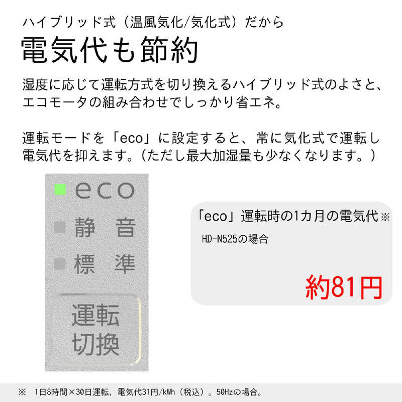 ・気化ハイブリッド式採用 「気化式」と「温風気化式」を組み合わせたのがハイブリッド式です。湿度が低いときは「温風気化式」ですばやく加湿し、設定湿度に近づくと「気化式」で加湿量を調整します。湿度に応じて2つの方式を切替えるので、電気代のムダを抑えることができます。