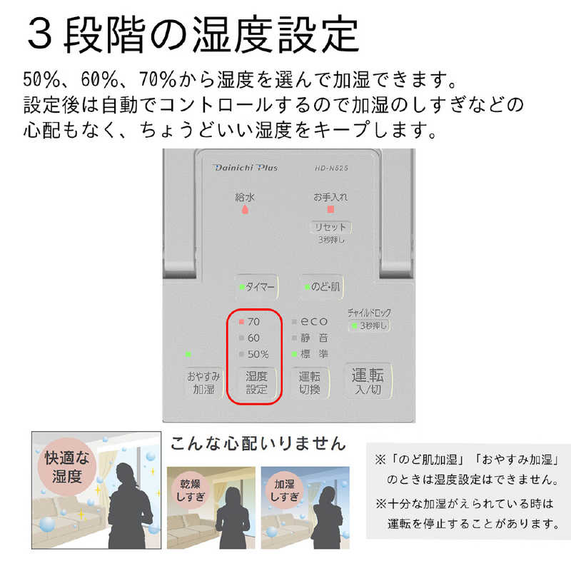●「湿度設定」 50%、60%、70%と湿度を選んで加湿できます。