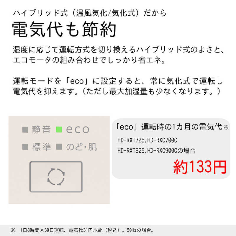 ・気化ハイブリッド式採用 「気化式」と「温風気化式」を組み合わせたのがハイブリッド式です。湿度が低いときは「温風気化式」ですばやく加湿し、設定湿度に近づくと「気化式」で加湿量を調整します。湿度に応じて2つの方式を切替えるので、電気代のムダを抑えることができます。