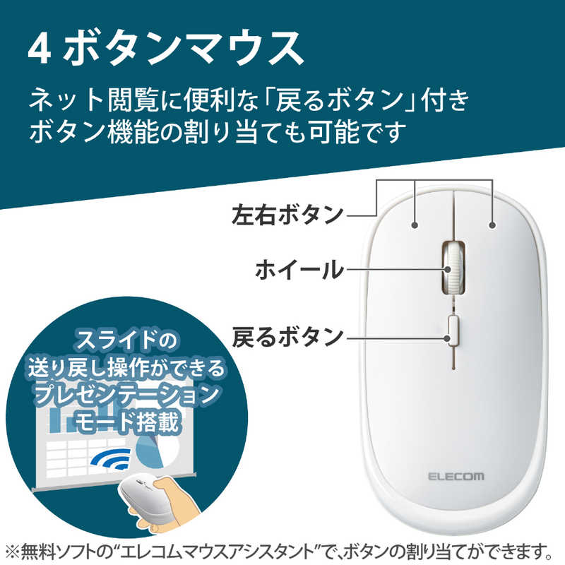 ・無料でダウンロードできるボタン機能割り当てソフトウェア“エレコムマウスアシスタント”を利用すると、ボタンをお好みの機能にカスタマイズできます。