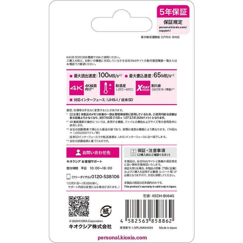 キオクシア KIOXIA SDXCカード EXCERIA PLUS Class10 64GB ピンク KSDH-B064G