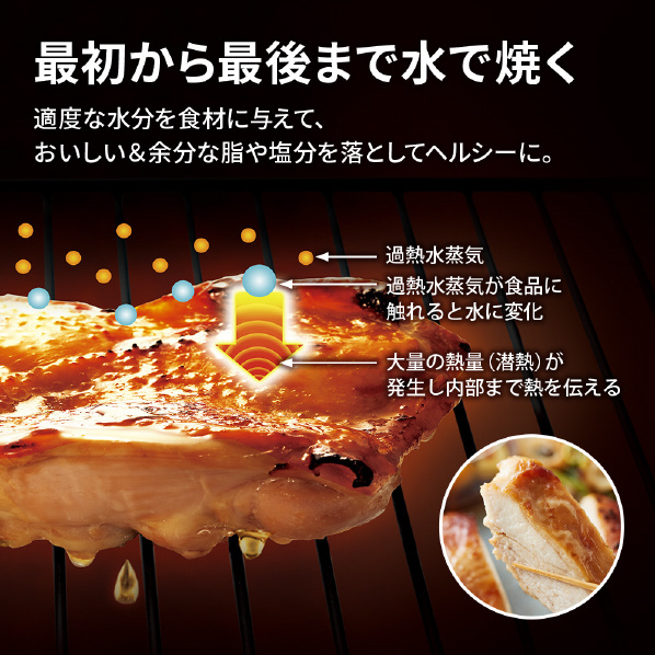 ●水のチカラで、揚げ物、焼き物のおかずやパンをまるでできたてのようなおいしさに復元する「ヘルシオあたため(おいしさ復元)」
