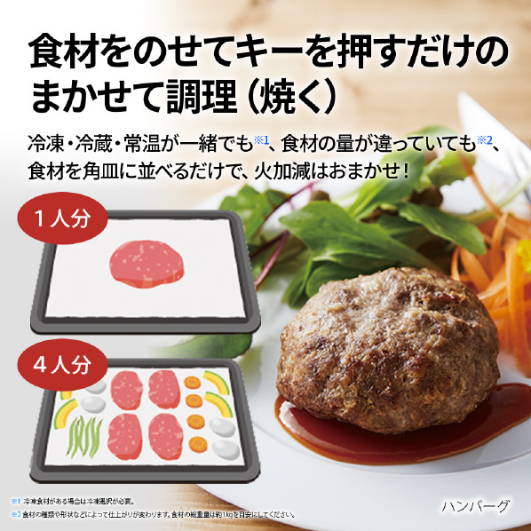 ●冷凍・冷蔵・常温が一緒でも、好みの種類・分量の食材を角皿において、キーを押すだけで焼き物料理が自動でちょうどよく仕上がる「まかせて調理 焼く」※冷凍あり・なしの選択が必要です。