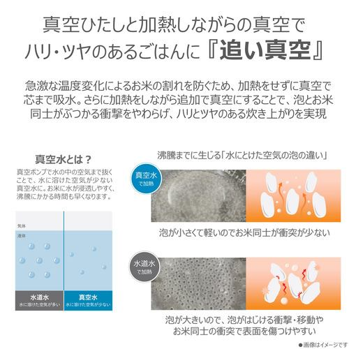 炊飯工程に追い真空を新たに設け、水の中の空気をしっかり抜き、お米の芯までの吸水はもちろん、加熱や蒸らし精度をさらに更新。真空だからできる技!