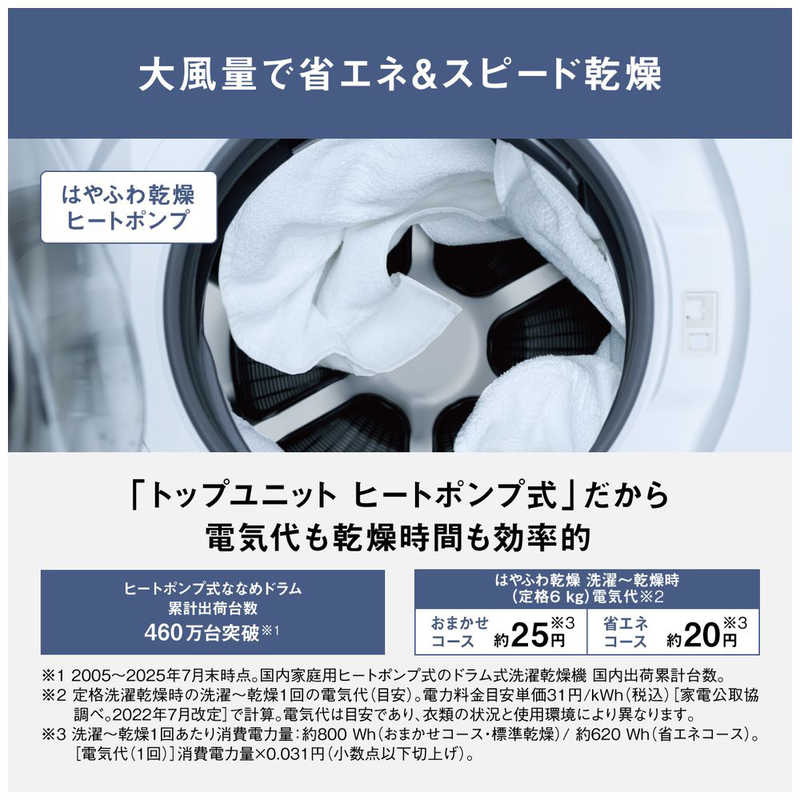 トップユニット ヒートポンプ式だから、大風量で省エネ&スピード乾燥。2025年度モデルは、運転時間はそのまま、消費電力量を従来より約10%削減(※洗濯~乾燥「おまかせ」コース・定格洗濯乾燥6kg時。当社2024年発売NA‐LX129DとNA‐LX129Eとの比較。衣類の素材・入れ方・洗濯時の状況により、運転時間・使用水量・消費電力量は前後します。※)、洗濯~乾燥時の電気代を節約。