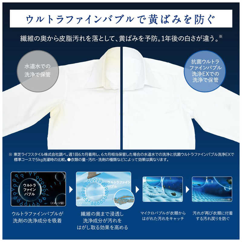 目に見えないナノサイズの泡「ウルトラファインバブル」と洗剤を効率よく混合させることで、黄ばみの原因となる落ちにくい皮脂汚れを繊維の奥からしっかり落とし衣類の黄ばみを抑制します。