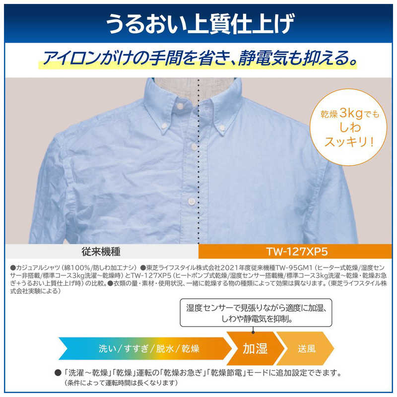 大きな洗濯槽とヒートポンプユニットのやさしい温風、大風量により、最大7kgの衣類を洗濯から乾燥まで約87分でスピーディに乾燥し、ふんわり仕上げます。