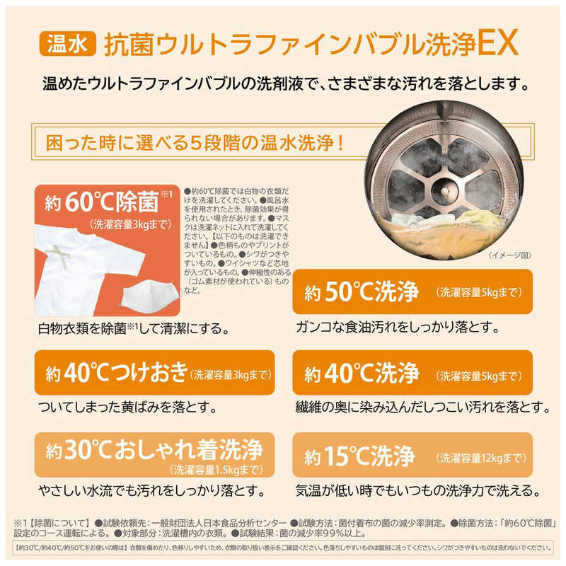 ハイパワーUVと温風で衣類を除菌する「UV除菌洗乾」「UV温風除菌」、温水による「約60℃除菌」の3つの除菌機能を搭載しています。
