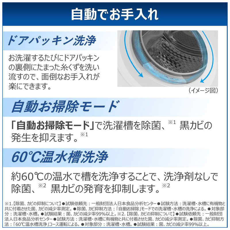 自動お掃除モード(洗濯槽・ドアパッキン)、自動槽乾燥カビプロテクト、槽洗浄めやすサインなど洗濯槽を清潔に保つ機能も充実!
