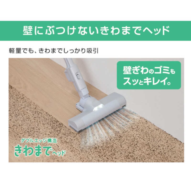 ●壁際のゴミの取り逃しを防ぐ【きわまでヘッド】を新搭載。壁際のごみもしっかり吸引出来る形状です。