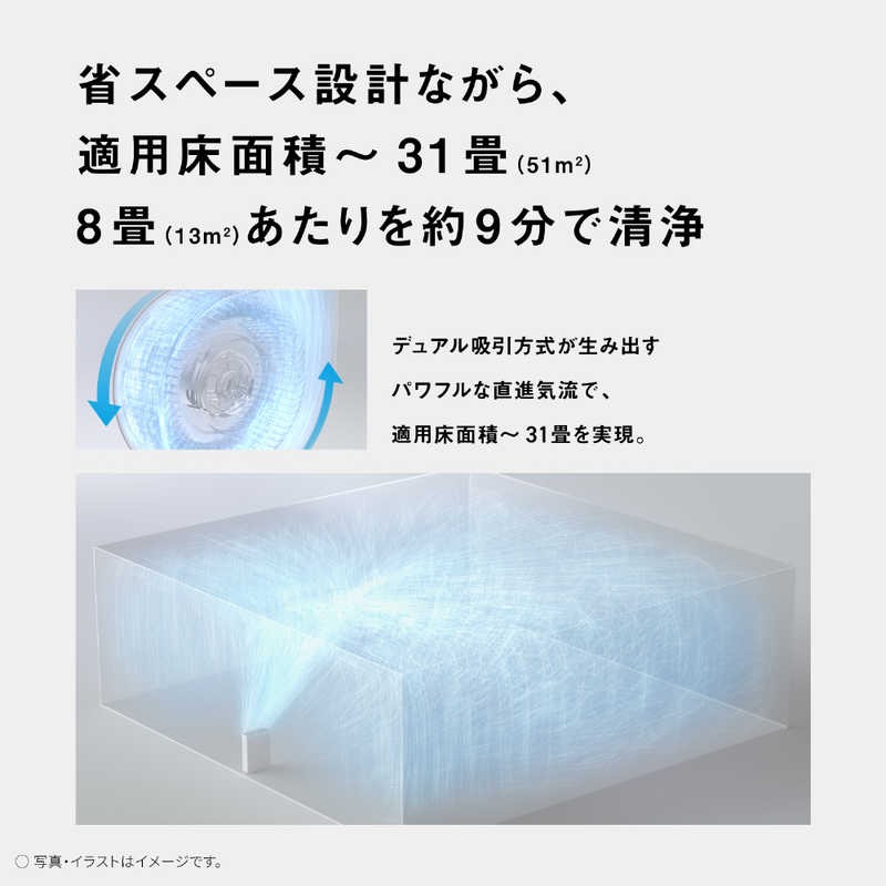 ●設置面積1/2(当社比)(※加湿機能はありません。)(※【比較条件】当社同風量帯における機種での設置面積との比較。【設置面積】23年発売F-VXW70 1,023cm2、25年発売F-PX70C 475cm2※)で、パワフルに集じん